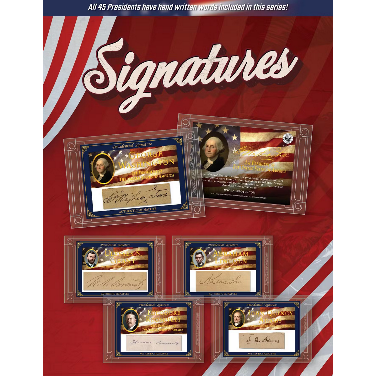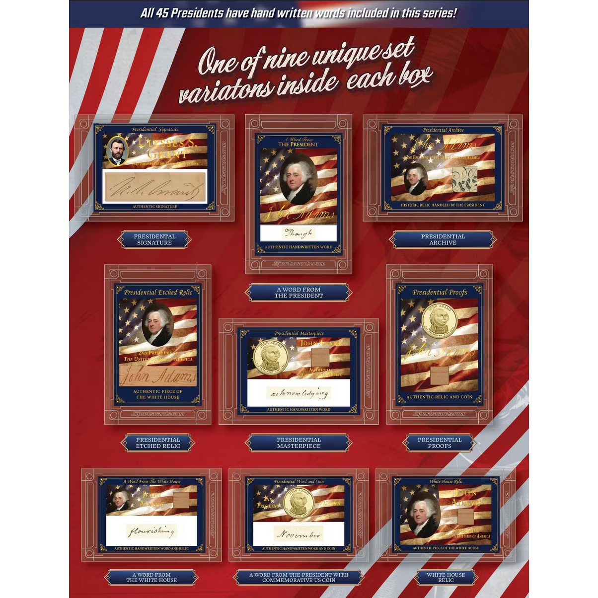 Los 45 hombres que han ocupado la Presidencia de los Estados Unidos están representados en esta colección, con memorabilia escrita a mano, reliquias y firmas recortadas. ¡De la Casa Blanca a tu casa: sostiene la Historia de América en tus manos!