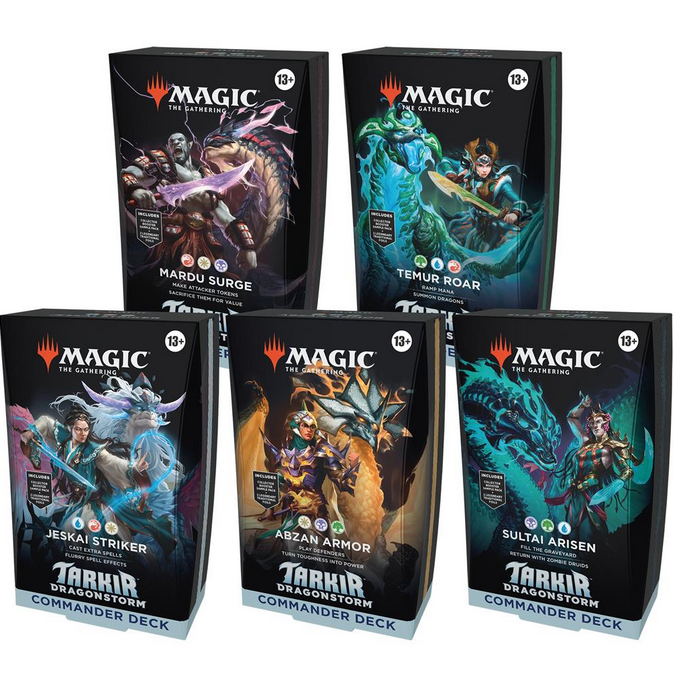 Consigue la caja de 5 mazos Commander de Magic: The Gathering – Tarkir Dragonstorm en español y lleva tus duelos al siguiente nivel.