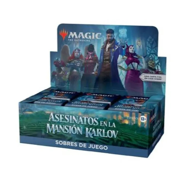 Tras una serie de asesinatos espeluznantes, Rávnica se encuentra al borde del caos y algunos de sus ciudadanos más notorios están implicados en los crímenes. Ahora, varios detectives investigan los hechos... y tú estás entre ellos. Vuelve al popular plano de Rávnica en Asesinatos en la mansión Karlov, la singular versión de Magic de las historias de asesinatos misteriosos. Esta caja de sobres de juego de Asesinatos en la mansión Karlov contiene 36 sobres de juego, que son perfectos tanto para Limitado como para abrir por diversión. Cada sobre de juego incluye 14 cartas de Magic: The Gathering y 1 ficha, carta publicitaria, tarjeta perforada con marcadores de sospecha o carta de arte (carta de arte normal en el 30 % de los sobres; carta de arte con la firma estampada en foil en el 5 %). Cada sobre incluye una combinación de entre 1 y 4 cartas raras o de una rareza superior, entre 3 y 6 poco comunes, entre 6 y 9 comunes y 1 carta de tierra (tierra con arte completo en el 33% de los sobres). Una carta de cualquier rareza es foil tradicional. La carta de tierra también es foil tradicional en el 20 % de los sobres y en el 12 % de ellos puede conseguirse una carta especial de la historia de Magic. No incluye reglamento.