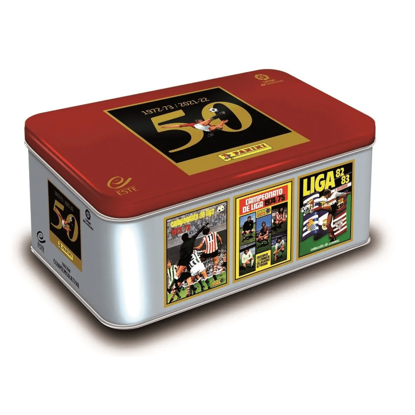 ¡Celebra el 50 aniversario de la colección de cromos Liga Este 2021-22 con esta TIN BOX CONMEMORATIVA! Esta caja espectacular es una pieza de coleccionismo única, decorada con icónicas portadas históricas que han marcado generaciones. En su interior encontrarás un total de 75 cromos cuidadosamente seleccionados, ¡incluyendo 28 cromos exclusivos!