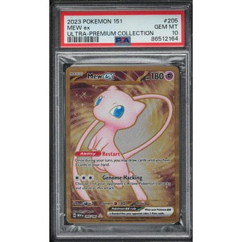 Carta Gradeada por PSA con un 10 de Mew ex Metálica de la Ultrapremium Collection en estado Mint de la colección de 151 en idioma Inglés.