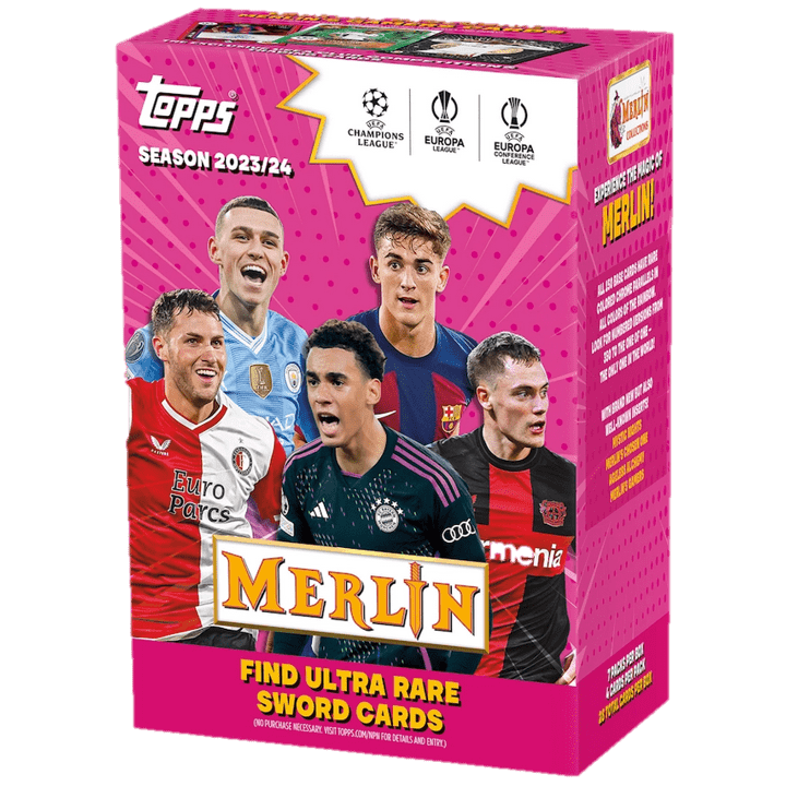 Merlin UEFA Club Competitions 2023/24 presenta nuevos y emocionantes rookies y superestrellas a través de un set base de 150 cartas. Busca variaciones raras de novatos, inserts nuevos y que vuelven como Mystic Nights, Merlin's Chosen One, Ageless Alchemy, además del exclusivo insert Merlin's Gamers que presenta diferentes diseños. Busca las superraras Sword Cards.