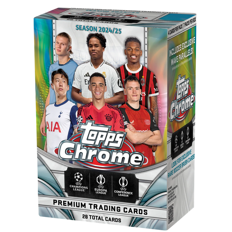 La caja Topps UEFA Club Competitions Chrome 2024/25 ya está aquí, ¡repleta de las mayores estrellas, jóvenes talentos prometedores e íconos legendarios del fútbol europeo! Esta colección es un verdadero resumen de lo mejor del fútbol, con el regreso de insertos favoritos de los fans como Wonderkids y Golazo, junto con nuevos y emocionantes subconjuntos y cartas espectaculares para coleccionar. ¡Cada caja contiene 28 cartas!