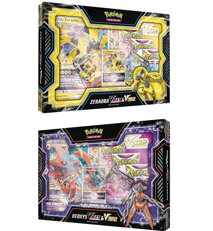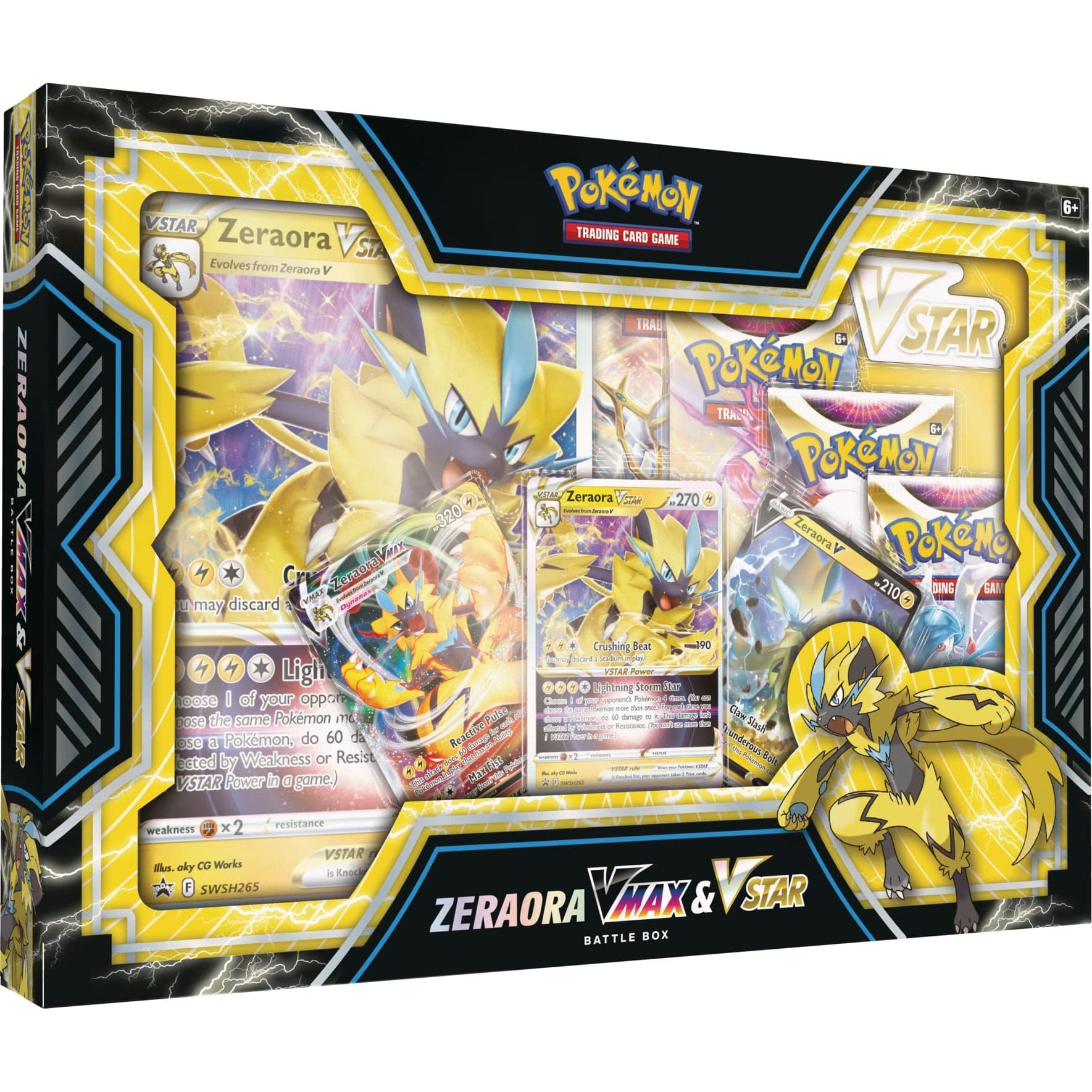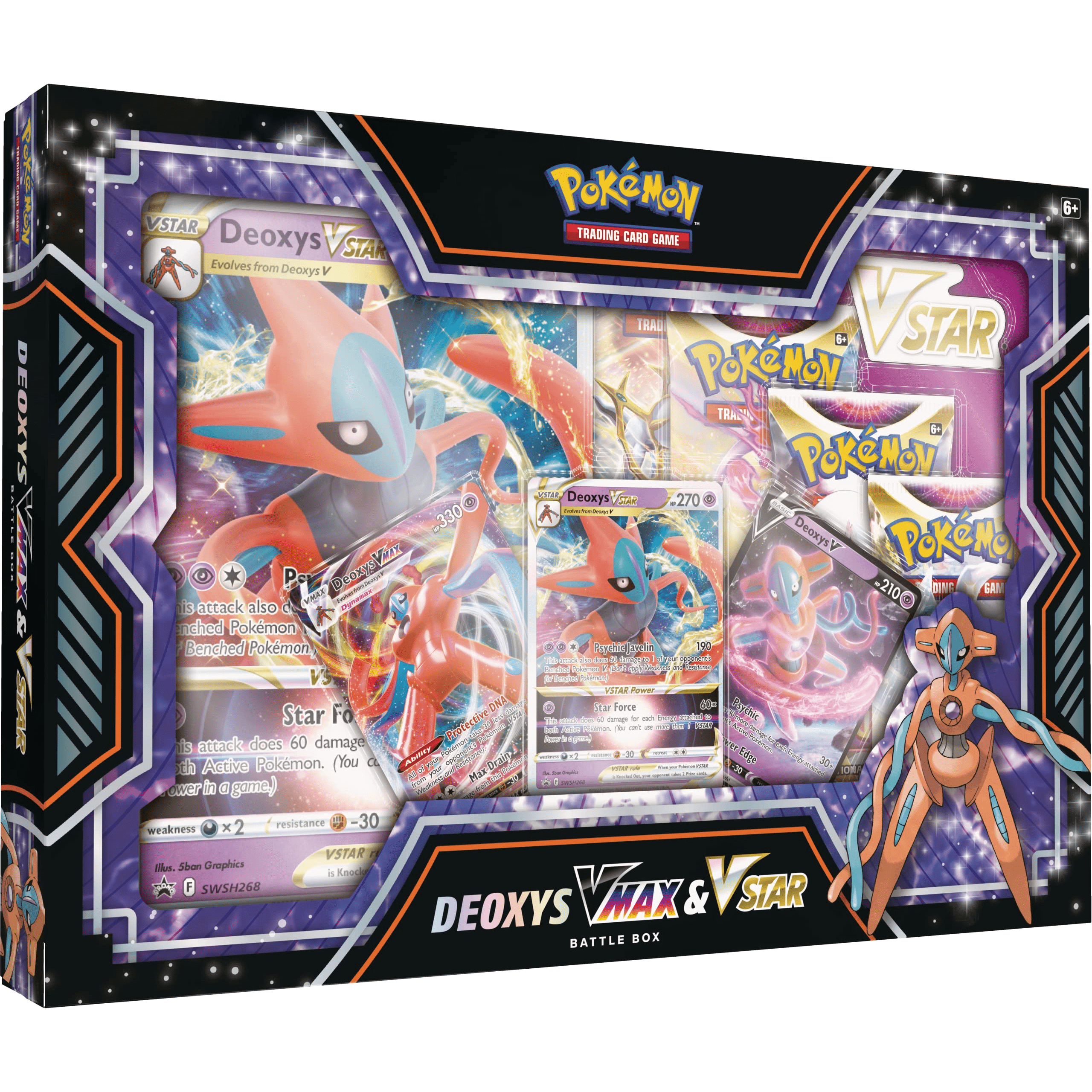 Puedes evolucionar a Deoxys V para aprovechar el alto HP de Deoxys VMAX en Defense Forme o el devastador VSTAR Power de Deoxys VSTAR en Attack Forme, o evolucionar a Zeraora V para contrarrestar la estrategia de tu oponente con los contundentes ataques de Zeraora VMAX o el relámpago. llamativo VSTAR Potencia de Zeraora VSTAR. También encontrarás una impresionante tarjeta de gran tamaño que muestra el Pokémon VSTAR destacado, paquetes de refuerzo, una guía de estrategia y un marcador VSTAR para la batalla.